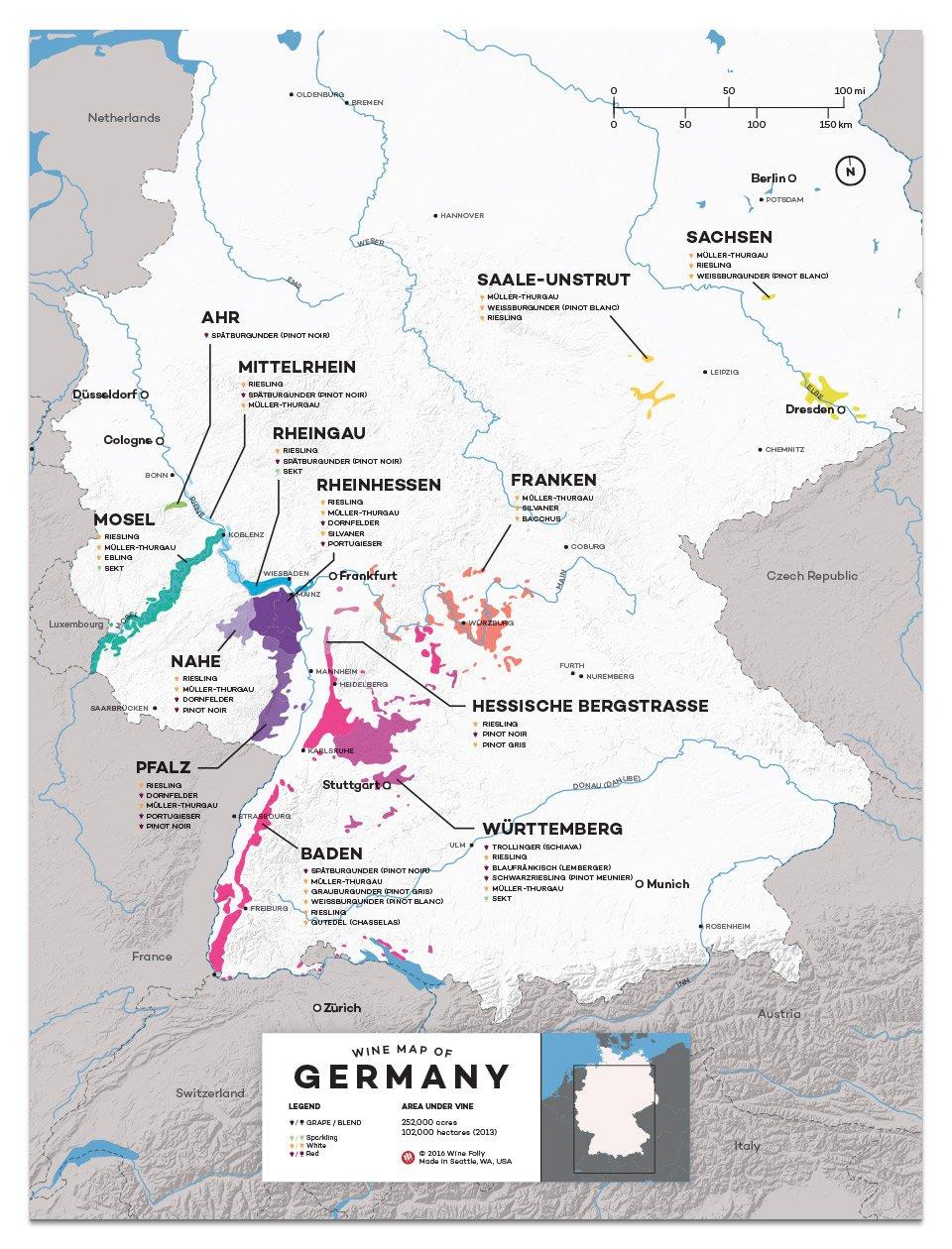 Map of Germany wine. Germany wine map (Western Europe - Europe) to print. Germany wine map (Western Europe - Europe) to download. German wine is primarily produced in the west of Germany, along the river Rhine and its tributaries, with the oldest plantations going back to the Roman era. Approximately 60 percent of the German wine production is situated in the federal state of Rhineland-Palatinate, where 6 of the 13 regions (Anbaugebiete) for quality wine are situated. Germany has about 102,000 hectares (252,000 acres or 1,020 square kilometers) of vineyard as its shown in Germany wine map, which is around one tenth of the vineyard surface in Spain, France or Italy. The total wine production is usually around 9 million hectoliters annually, corresponding to 1.2 billion bottles, which places Germany as the eighth largest wine-producing country in the world. White wine accounts for almost two thirds of the total production.